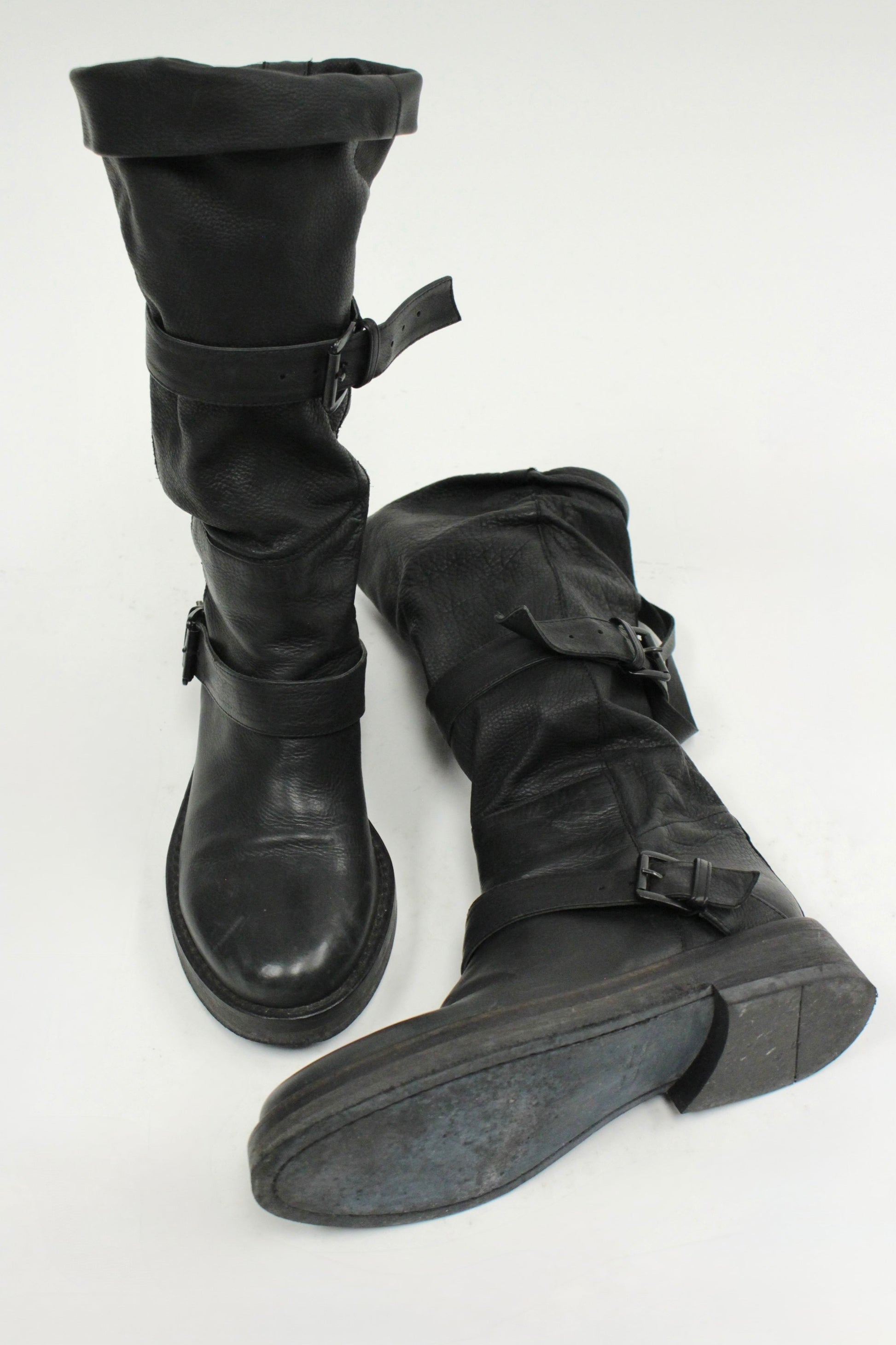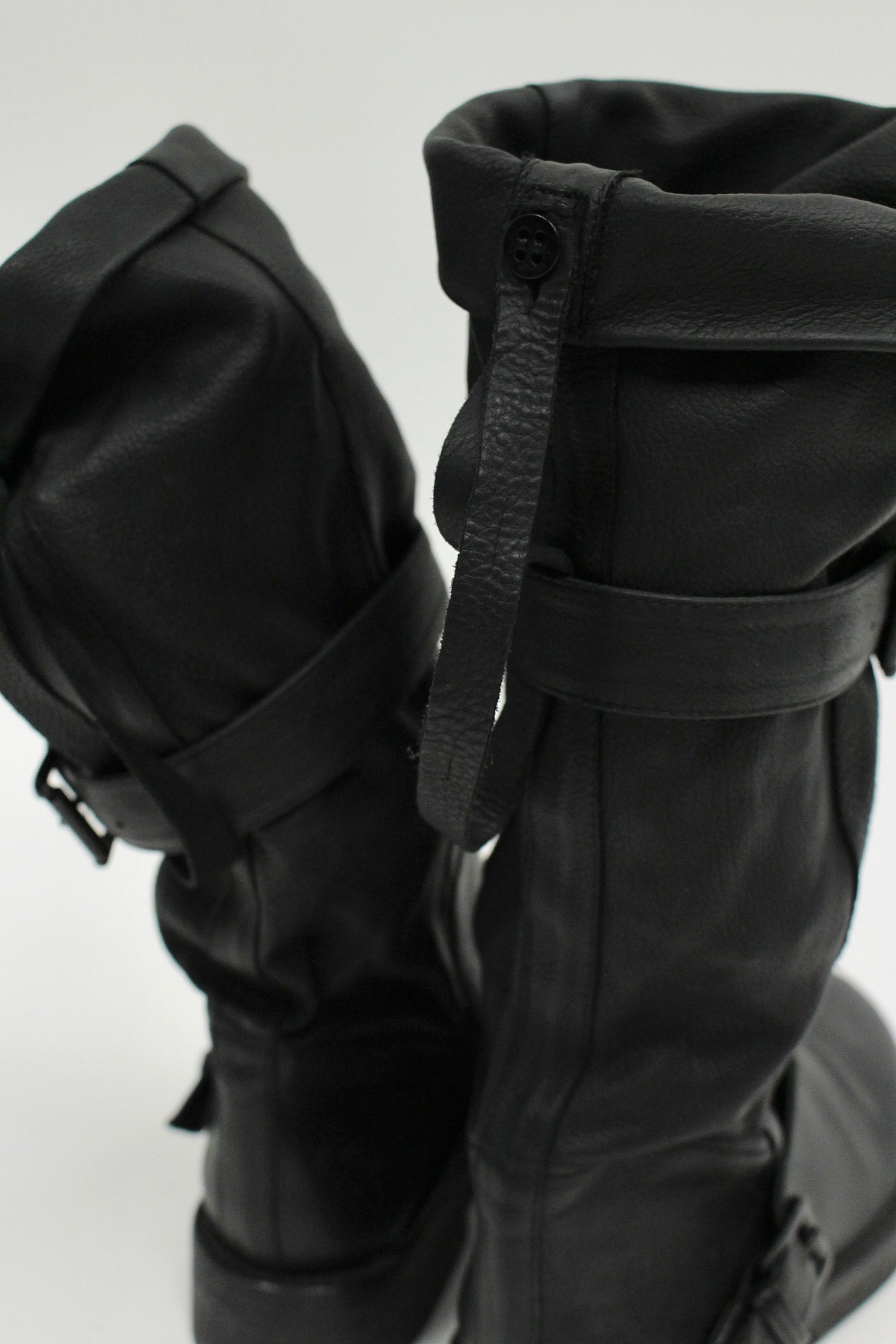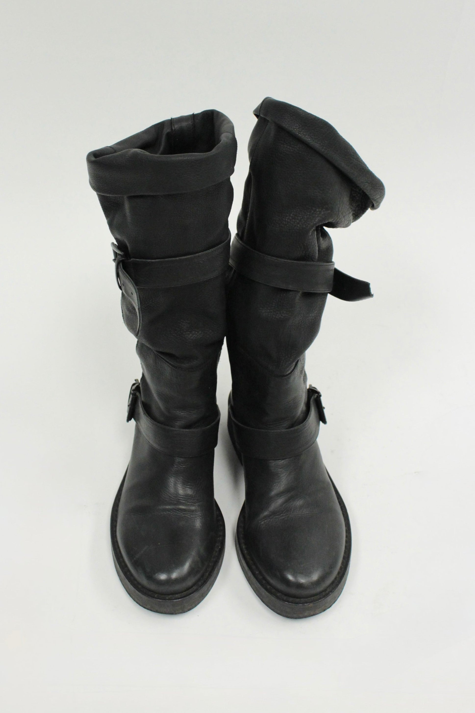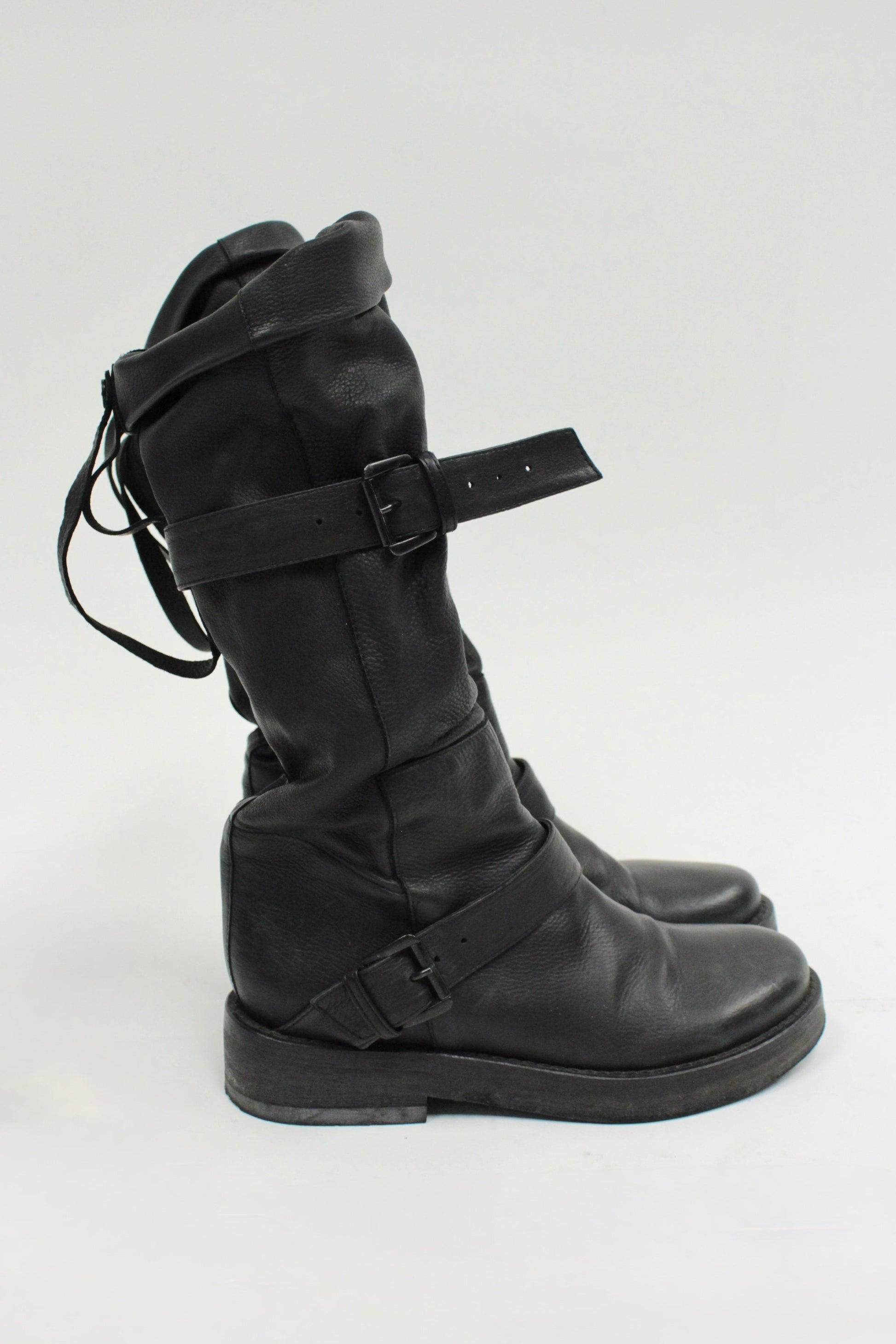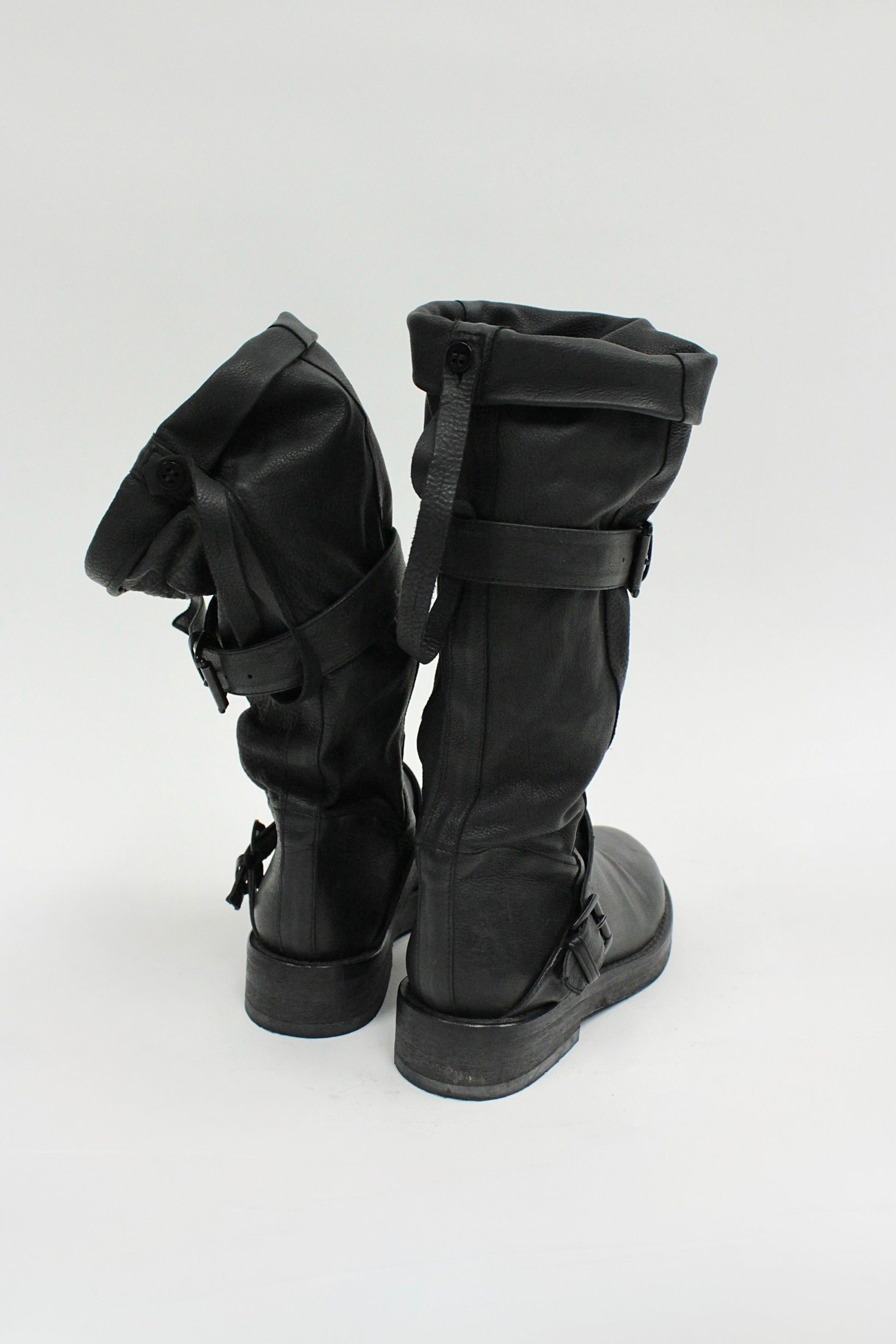 Iconic Pirate boots from Ann Demeulemeester’s Blanche line, crafted from soft black leather with a tall, slouching shaft. Features adjustable wraparound straps with metal buckles and a sturdy stacked sole. Made in Italy.