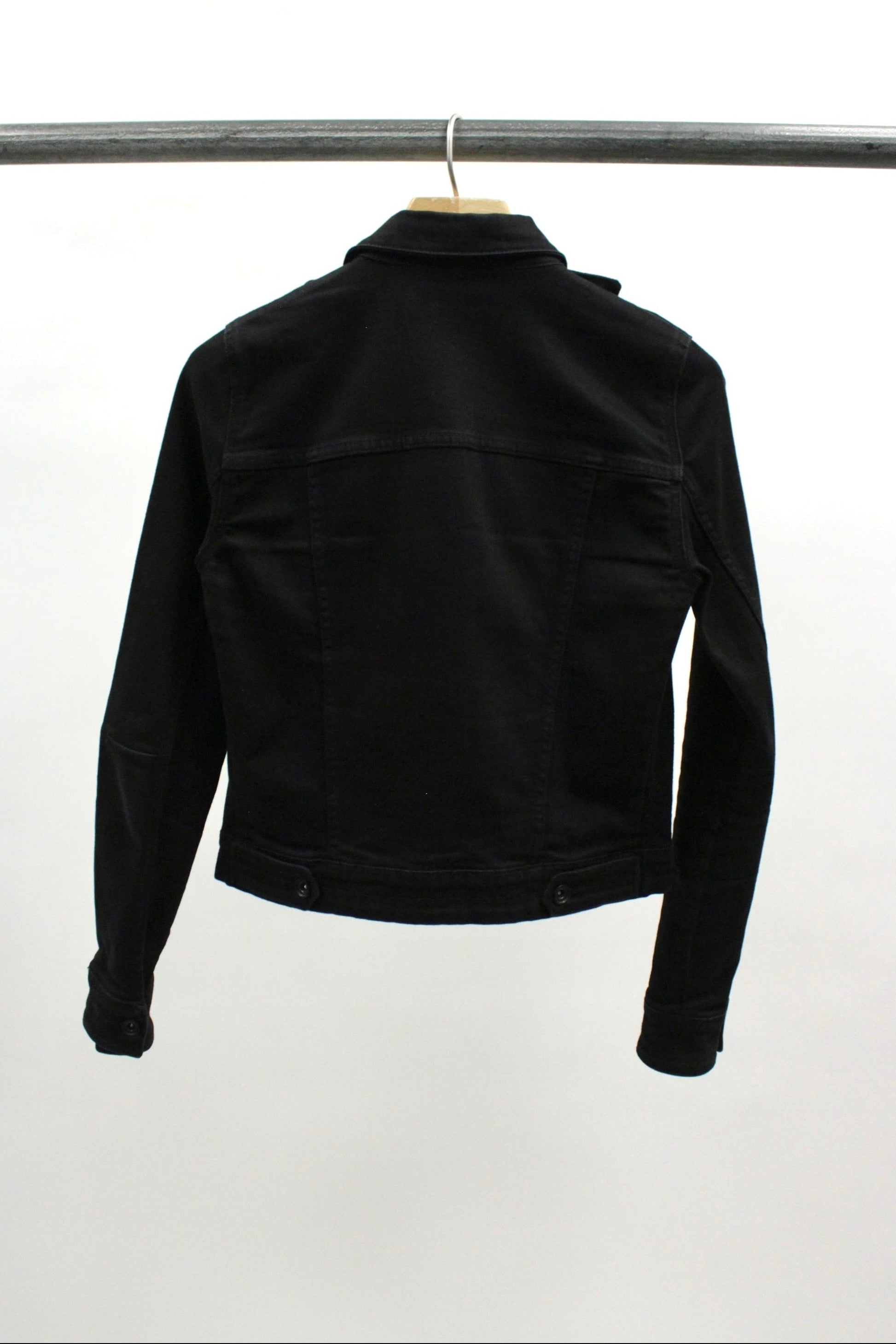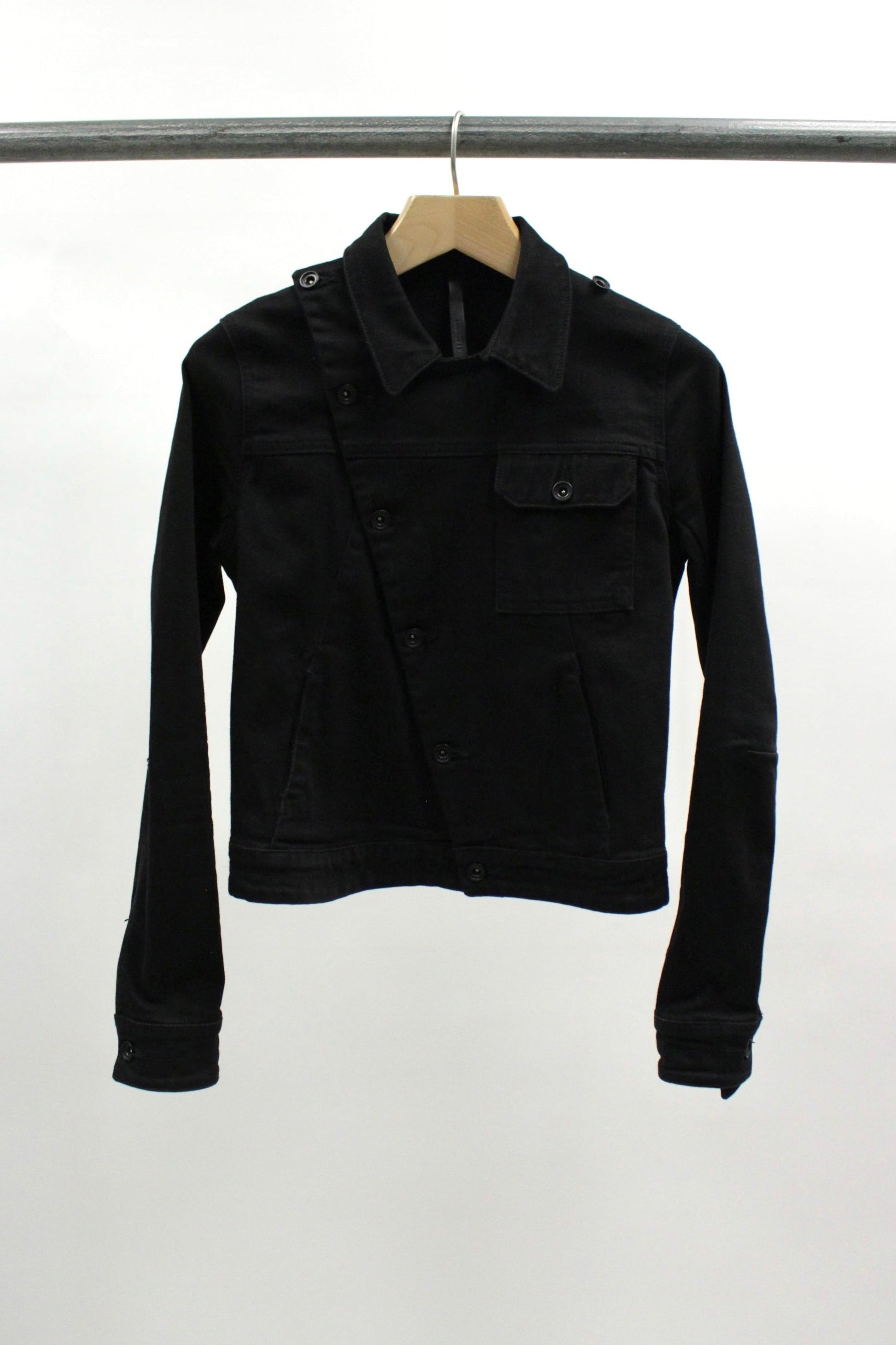 This F/W15 Barbara I Gongini asymmetrical denim jacket is crafted from a structured black cotton blend and features an off-center button closure that runs diagonally across the front. Designed with a sharp collar, long sleeves, and a single flap chest pocket.