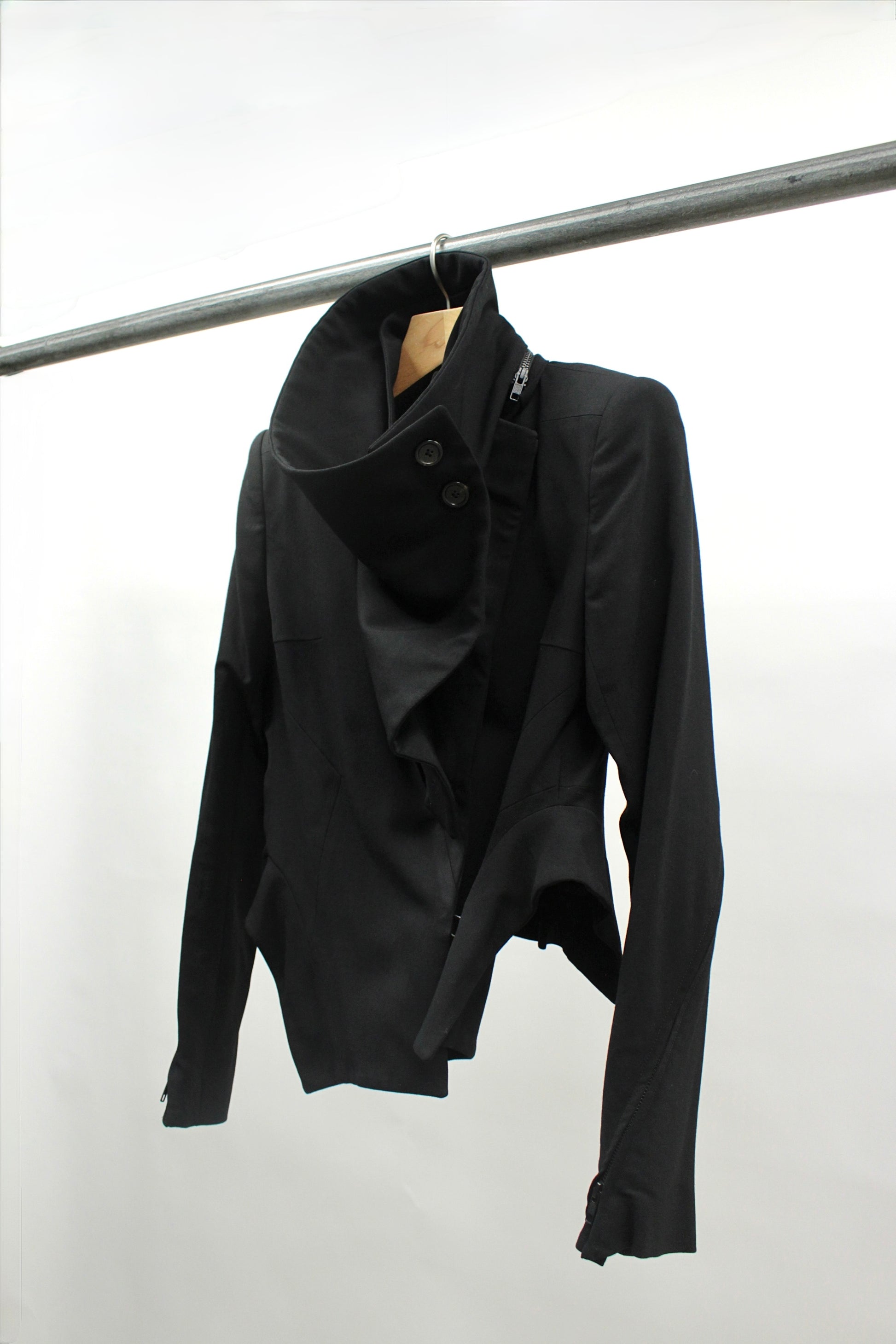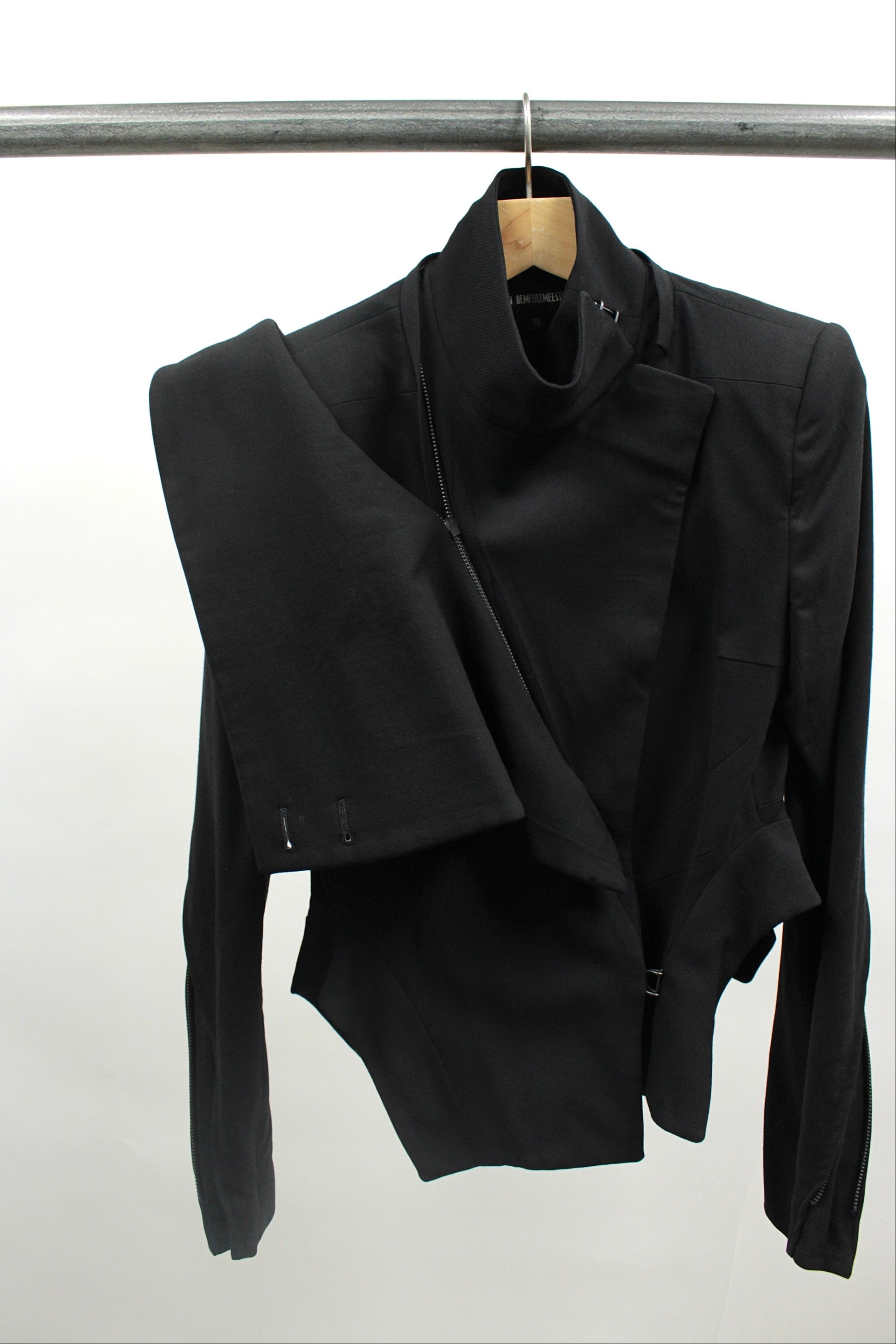 This Ann Demeulemeester Fall/Winter 2012 jacket features a deconstructed tailored silhouette with a dramatic removable asymmetrical draped collar that creates sculptural volume around the neckline. The design includes curved zippers along the back of the sleeves, a nipped waist, lightly padded shoulders, i