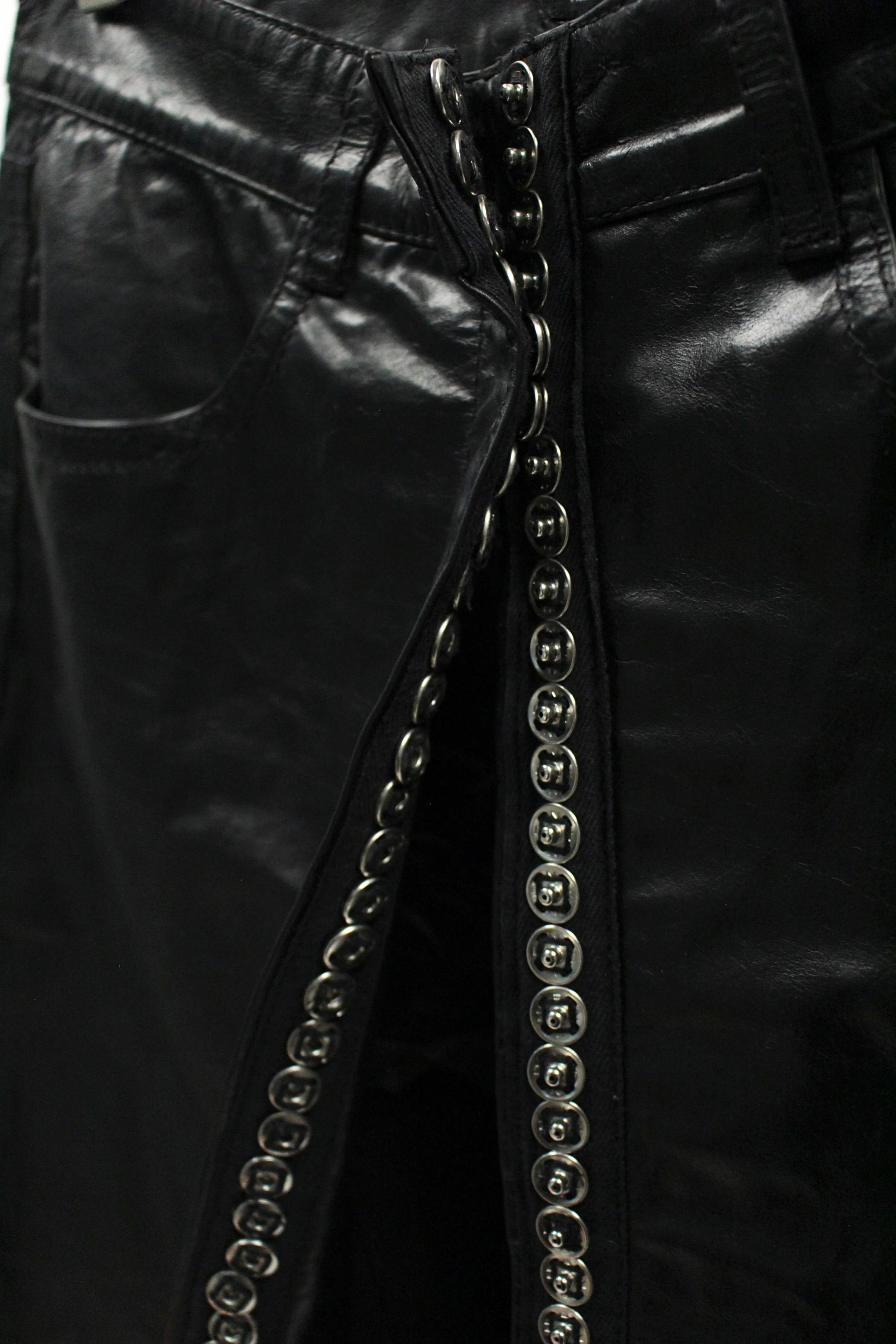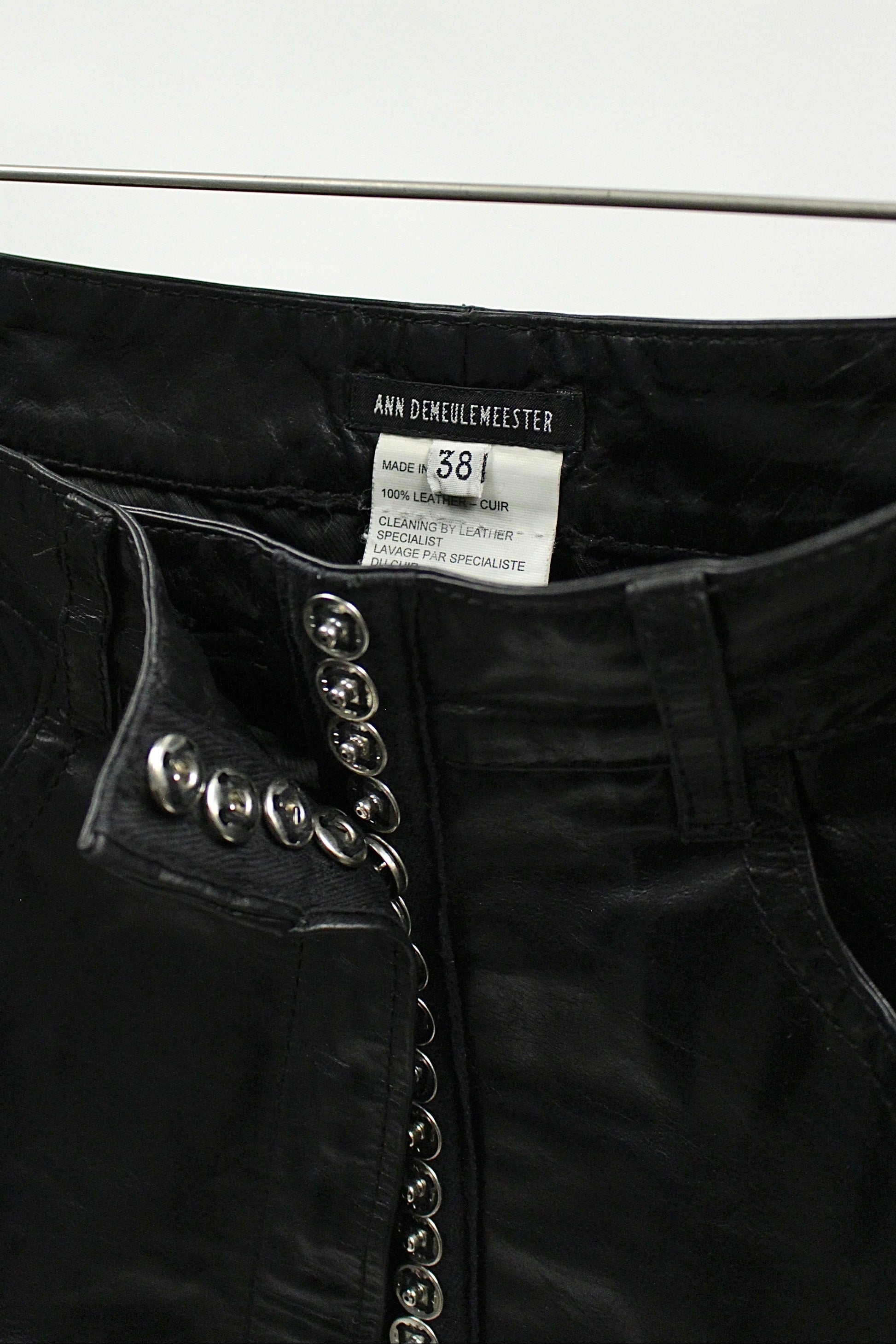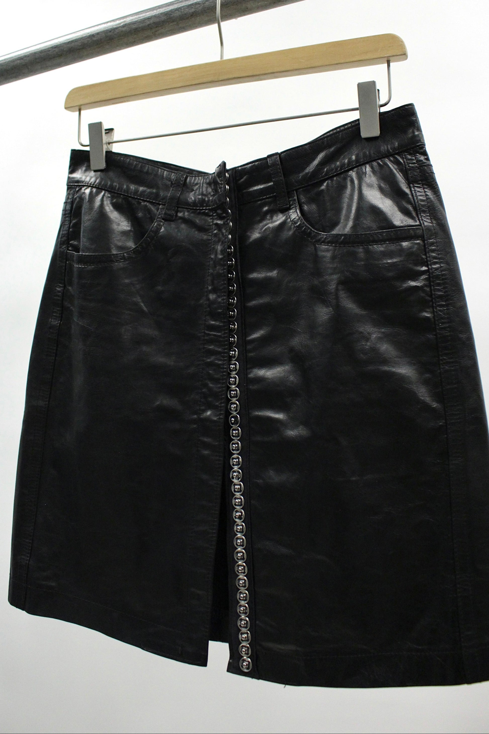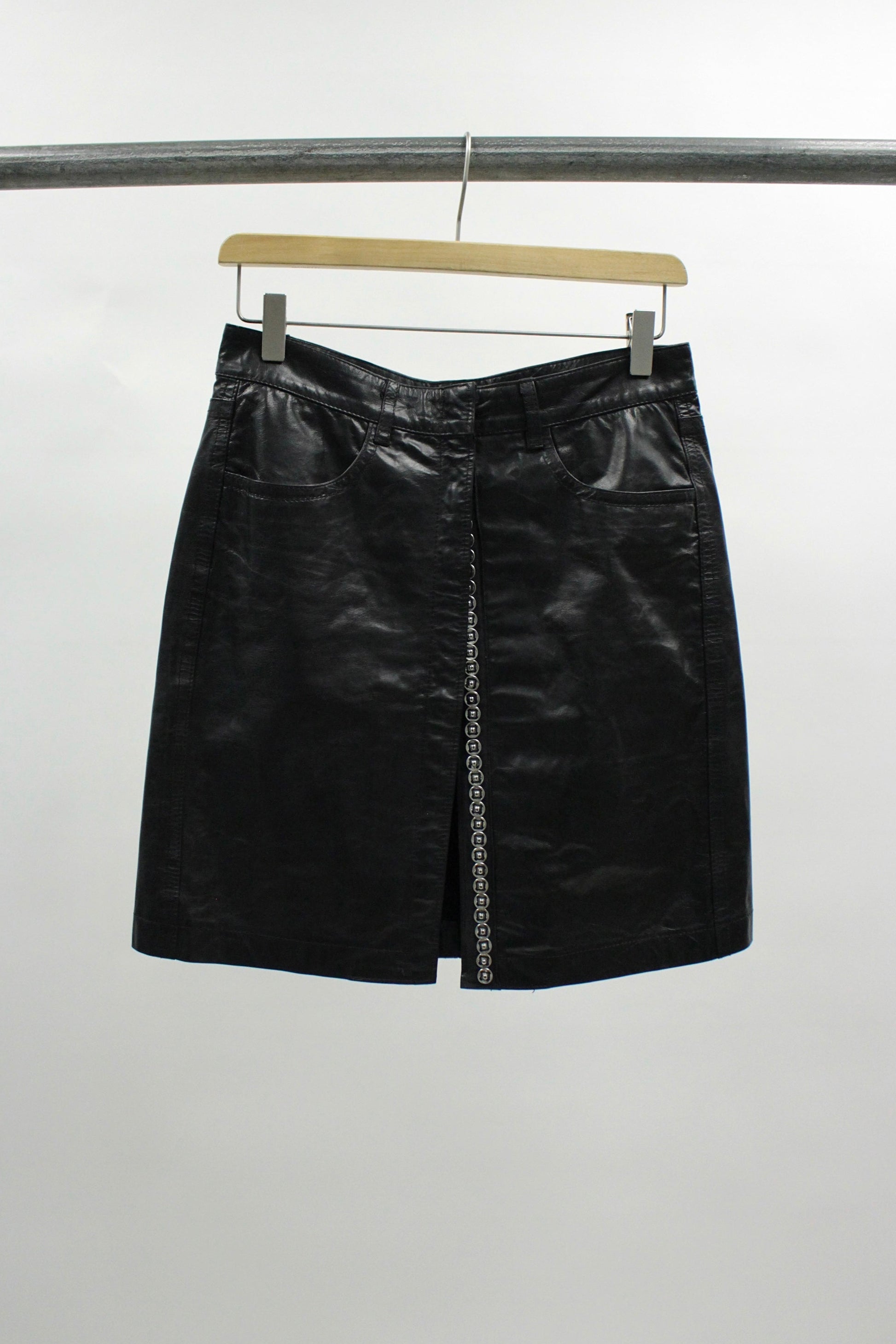 This black leather mini skirt from Ann Demeulemeester’s S/S 2001 collection features a structured, slightly A-line silhouette crafted from smooth, glossy leather. The design includes front patch pockets, belt loops, and a full-length front closure finished with silver snap buttons. Fabric content : 100% leather, lining: 100% rayon. Made in Belgium.